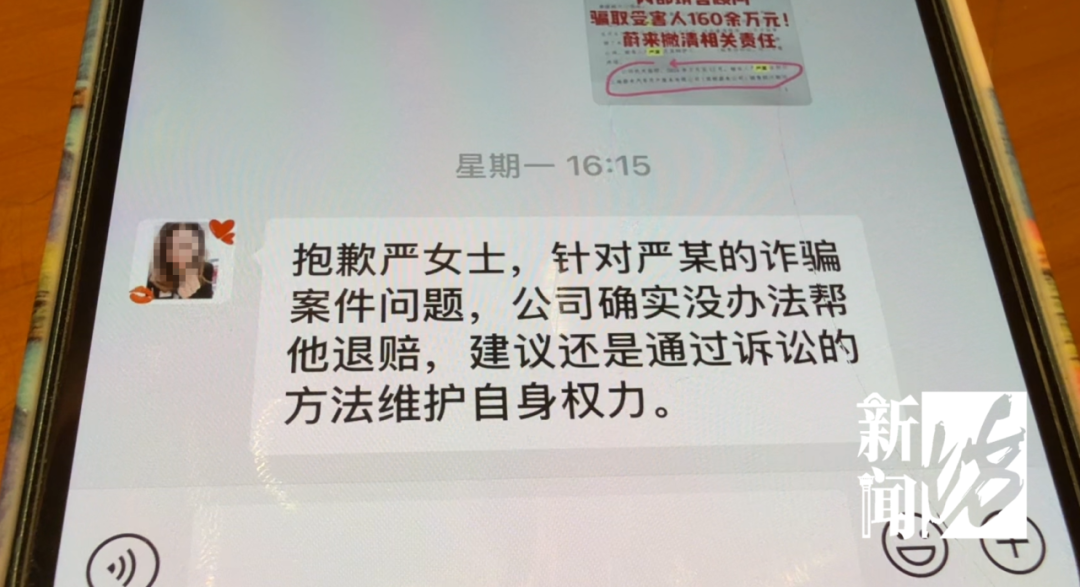 直到去年11月底,因销售严某失联,严女士发现不对劲并报警。警方抓捕严某时,他已诈骗160万余元。最终,严某被嘉定法院以诈骗罪判处有期徒刑十年三个月。