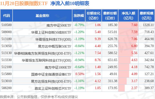 当日有230只股票指数ETF基金出现资金净流入,其中南方中证500ETF(510500)净流入排首位,其份额增加了1.06亿份,净流入额达7.6亿元。
