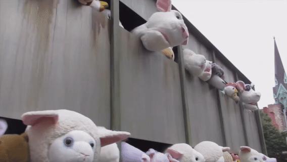 艺术家将象征童年纯真的毛绒玩具,塞进代表残酷死亡的屠宰场运输车,用最可爱的形象演绎最残酷的现实,讽刺的正是那套我们习以为常、却充满暴力的工业化屠宰体系。