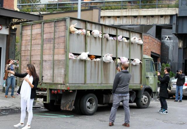 不过,这并非真实的动物运输,而是英国艺术家 Banksy 在纽约期间精心设计的一场街头展演——《羔羊的尖叫》。