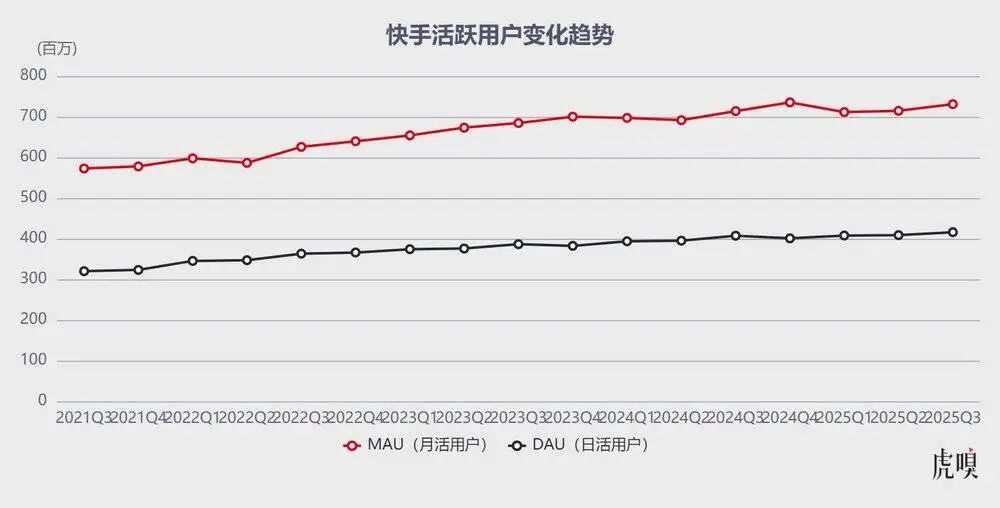 一是DAU(日活用户),2025Q3快手DAU同比增长1.7%,达4.16亿,环比增加800万,创历史新高。