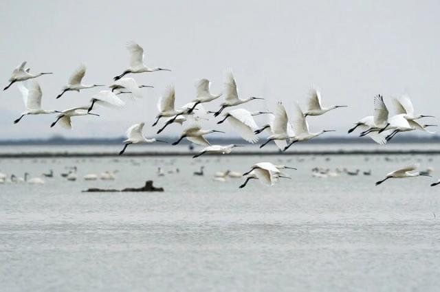 白琵鹭等候鸟在南昌市新建区昌邑乡附近水域飞翔。新华社记者 万象摄