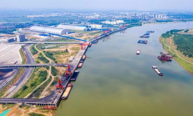 船舶在江西省宜春港樟树港区河西作业区综合码头装卸货物。周亮摄