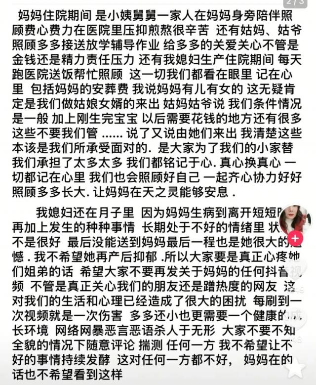 之后,该博主的女婿再次发文怀念母亲,并呼吁大家不要对此事胡乱猜测,也不要对其家人进行网络暴力。