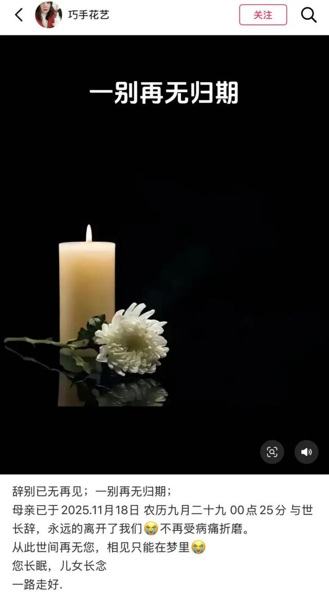 近日,湖北一位名为“巧手花艺”的博主因患癌不幸去世。其女儿用母亲的账号发布动态,悼念母亲于18日凌晨离世,年仅44岁。