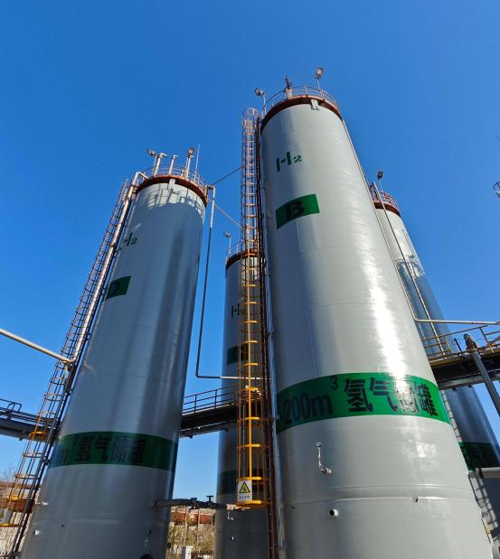 2. 制氢:绿电高效电解水制氢,环保又经济。厂区的风力—光伏电力系统发电后进行碱水电解制氢。电解液由高纯度氢氧化物按一定浓度溶解于净化水配制而成,可提升导电性、降低能耗。电极催化剂能提高电解效率,让水分子在直流电驱动下变为氢气和氧气。析出的氢气会被送进四个大储罐缓存,按需送往还原系统。与传统化石能源制氢相比,电解水制氢无硫氧化物、氮氧化物等污染物排放。