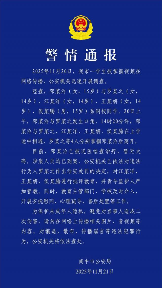 11月21日,四川阆中市公安局发布了一则警情通报。通报显示,2025年11月20日,该市一学生被掌掴的视频在网络上传播开来,公安机关迅速展开了调查。