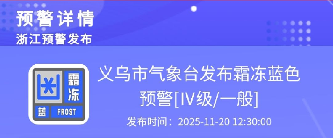 昨天(11月20日)12时30分,义乌市气象台发布了霜冻蓝色预警。