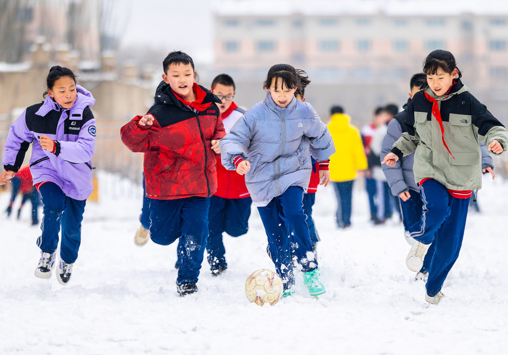 孩子在小学 校园雪地趣味足球赛比赛中拼抢。/视觉中国