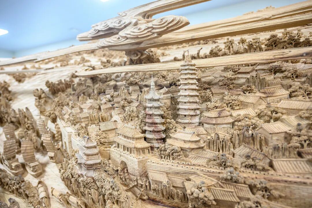 在莆田市美术馆内的大型木雕《京杭大运河》江南卷