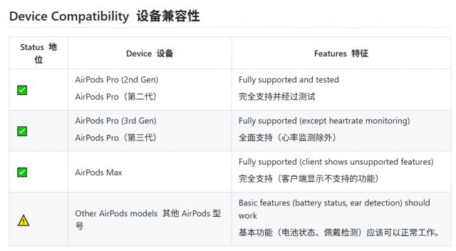 该项目甚至支持助听、自定义通透模式以及最多连接两台设备的多设备连接功能。不过,项目开发者指出,要启用这些高级功能,用户需将设备的供应商ID(VendorID)更改为苹果公司的ID。
