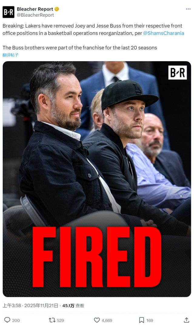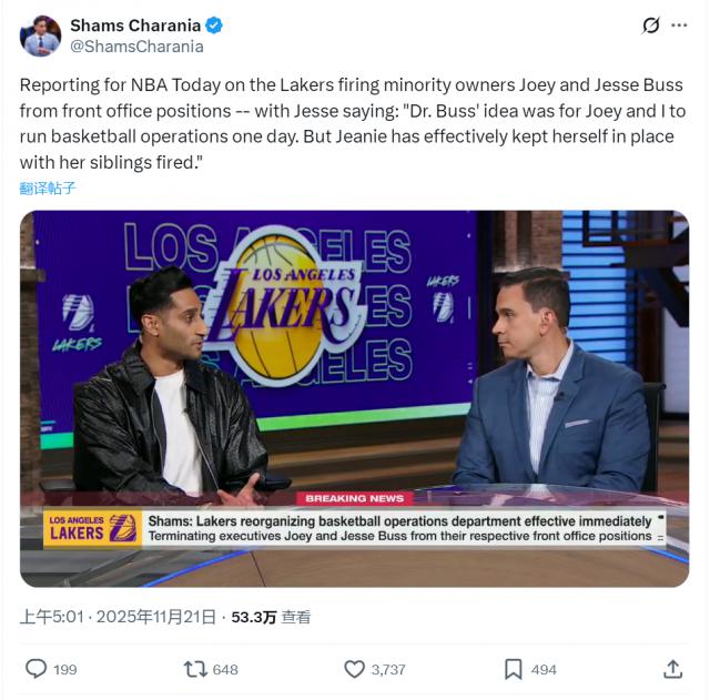 北京时间11月21日,据NBA名记Shams报道,湖人管理层出现重大变动,立刻解除了两个小老板乔伊 - 巴斯和杰西 - 巴斯在管理层的职务。尽管巴斯家族将大部分球队股份卖给了马克 - 沃尔特,但仍保留了15%的股份,这兄弟俩依旧是湖人小股东。
