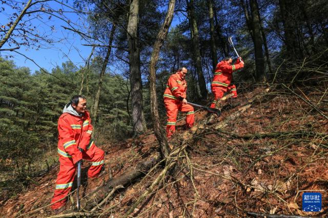 △张建(右)、张忠(中)、张华在贵州省毕节市七星关区拱拢坪国有林场护林巡山时清理林中倒伏的枯木(2019 年 1 月 3 日摄)。新华社发(王纯亮 摄)