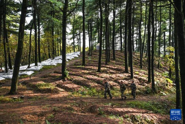 △张建(中)、张华(右)、张忠在贵州省毕节市七星关区拱拢坪国有林场巡山护林(11 月 13 日摄)。新华社记者 杨文斌 摄