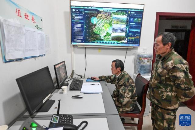 △张华(左)、张忠在贵州省毕节市七星关区拱拢坪国有林场值班室查看林区监控情况(11 月 13 日摄)。新华社记者 杨文斌 摄