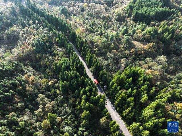 △张建、张华、张忠与同事驾驶森林巡防车在贵州省毕节市七星关区拱拢坪国有林场巡山护林(11 月 13 日摄,无人机照片)。新华社记者 杨文斌 摄