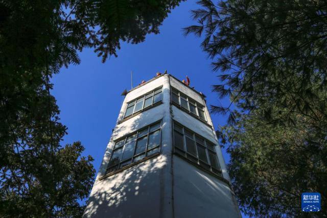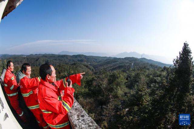 △张建、张忠、张华在贵州省毕节市七星关区拱拢坪国有林场的瞭望塔上观察林区动态(2019 年 1 月 3 日摄)。新华社发(王纯亮 摄)