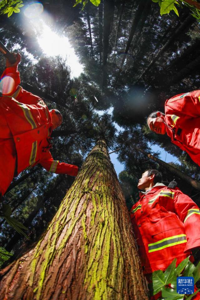 △张建(右)、张忠(左)、张华在贵州省毕节市七星关区拱拢坪国有林场观察林区动态(11 月 13 日摄)。新华社记者 杨文斌 摄
