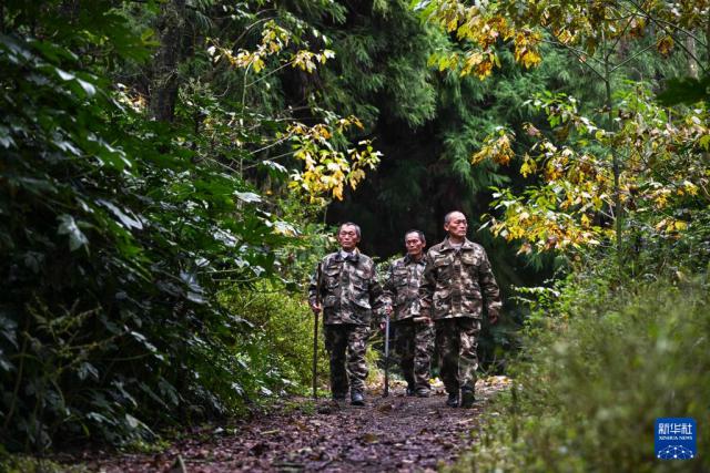 △张建(右)、张华(左)、张忠在贵州省毕节市七星关区拱拢坪国有林场巡山护林(11 月 13 日摄)。新华社记者 杨文斌 摄