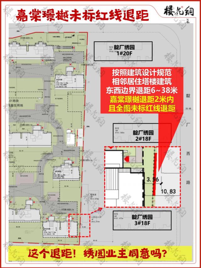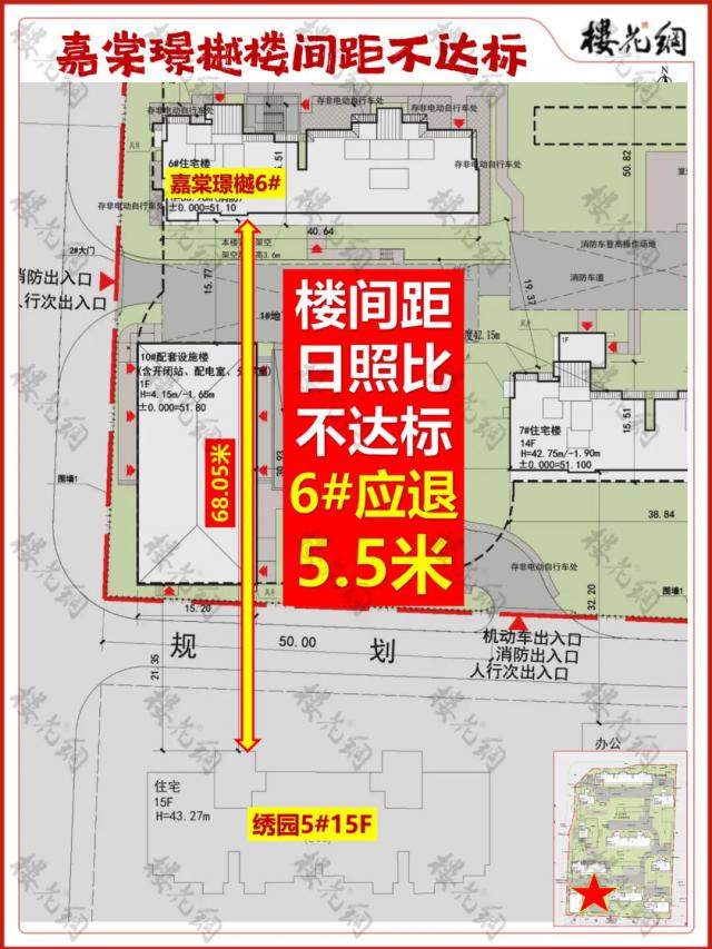 在嘉棠璟樾的西南位置,有一栋绣园5#,15层、高43.27米、两单元,具体是板楼还是塔楼无人知晓。花姐查询资料发现,嘉棠璟樾6#楼至少应后退5.5米,但后退的话整个楼盘规划都得重新调整。摊开图纸,楼间距日照比不达标的还有2#、4#楼。
