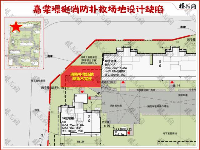 嘉棠璟樾容积率高达2.66,加上东面和南面的退距问题,楼栋排布紧张,甚至连消防扑救场地都缩减了。西北角的3#楼处有一块消防扑救场地,受转角红线影响缺了一角,导致扑救场地面积不够,按照建筑设计规划必须修改,毕竟消防关乎人命,不能马虎。