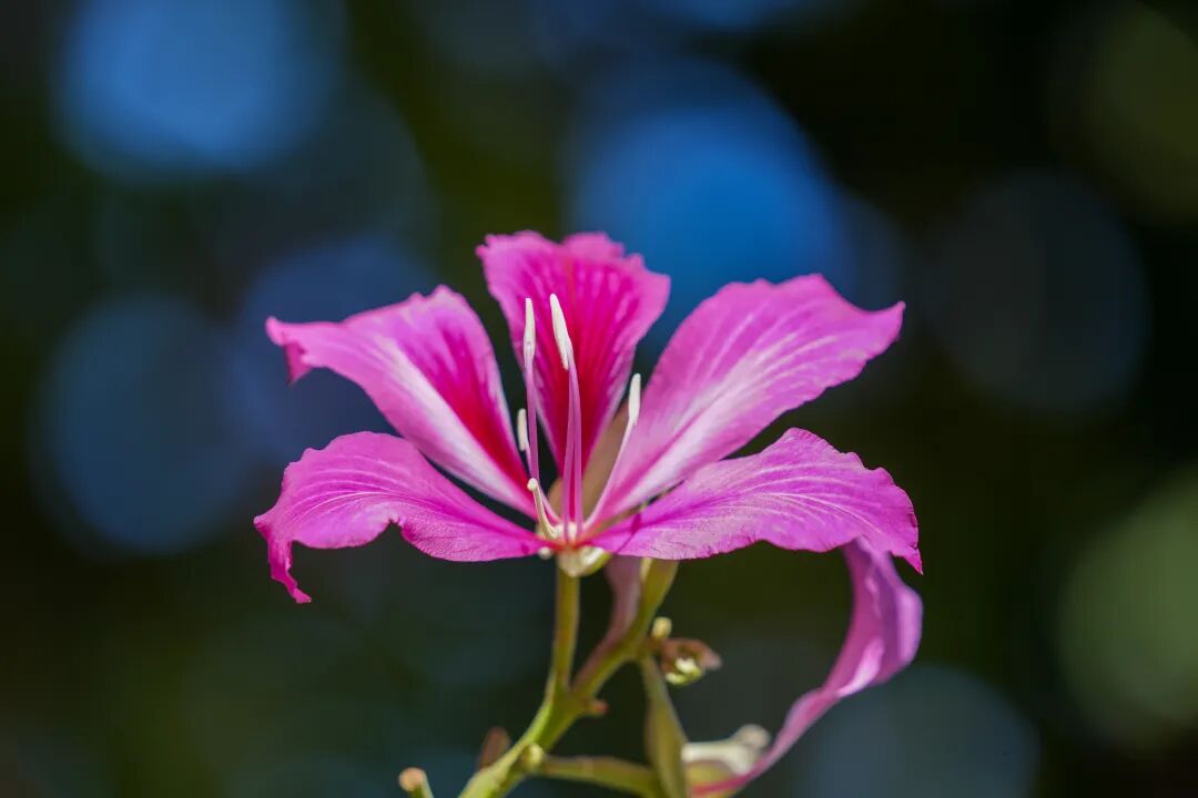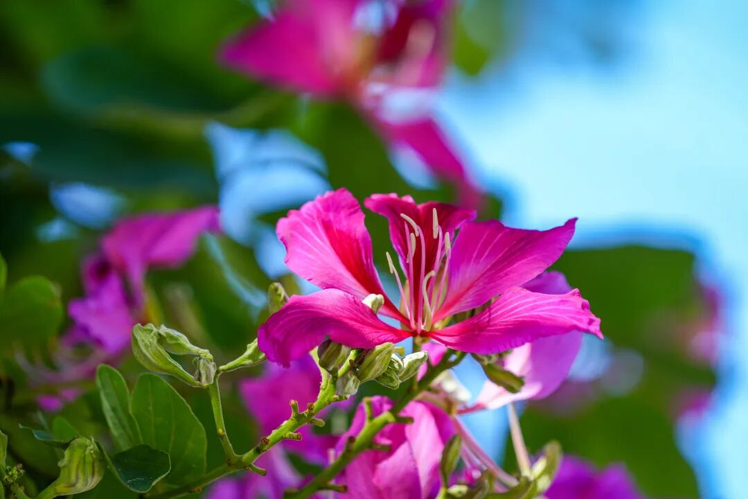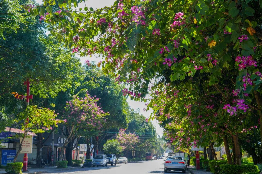 漫步在街头,目光所及之处皆是温柔。一簇簇、一团团粉紫色的花朵随风摇曳,紫荆花的花瓣薄如蝉翼,在阳光下泛着细腻的光泽,与湛蓝的晴空相互映衬。