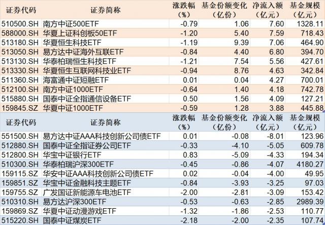 中证500ETF资金大幅流入,科创债ETF易方达资金流出超8亿