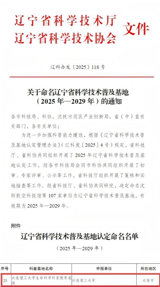大连理工大学生命科学科普教育基地获辽宁省科普基地认定