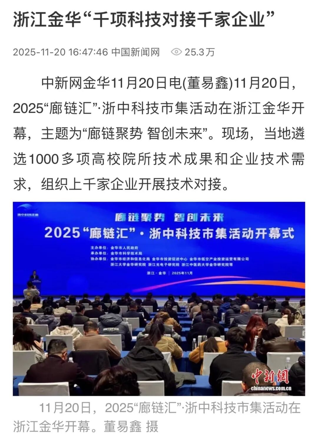 11月20日,中新网客户端报道《浙江金华“千项科技对接千家企业”》,关注2025“廊链汇”·浙中科技市集活动在金华开幕,现场遴选1000多项高校院所技术成果和企业技术需求,组织上千家企业开展技术对接。