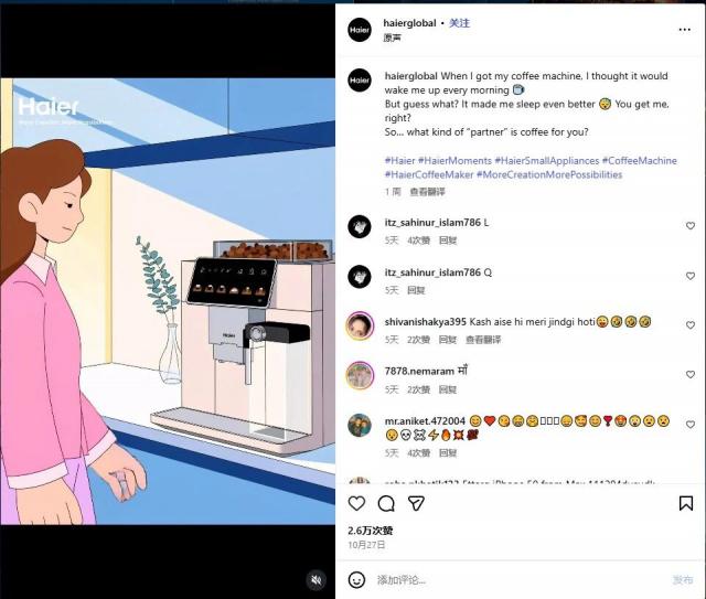 在具体操作中,海尔以第一人称与海外受众“对话”,并打造清晨起床的生活场景,拉近与海外受众的距离。如 10 月 27 日,海尔照片墙账号发布视频网帖称:“当我得到咖啡机时,我以为它每天早上都会叫醒我。但你猜怎么着?它让我睡得更好,你懂我,对吧?所以……咖啡对你来说是哪种‘伙伴’?”截至统计日,该网帖获得至少 2.6 万次点赞。