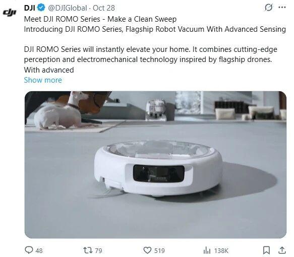在具体操作上,大疆以与境外普通消费者生活关联度较高的地面清洁产品为切入点策划议题,凭借议题的贴近性吸引了境外受众的关注。如 10 月 28 日,大疆海外社交媒体账号发布视频网帖,介绍其首款地面清洁产品。网帖称:“隆重推出大疆 ROMO 系列——带来洁净如新的家居体验!”截至统计日,该网帖观看量达 13.8 万次,收获 519 次点赞。