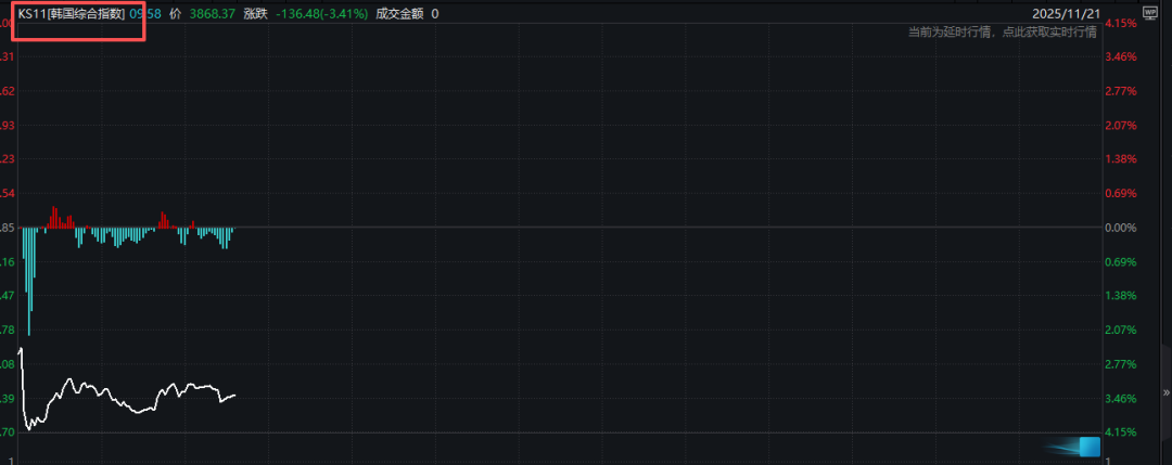 韩国股市跌势凶猛。韩国综合指数跳空低开,在盘中接连跌破4000点、3900点两大整数关口,下跌幅度超过百点,跌幅一度超过4%,随后跌幅有所收窄。