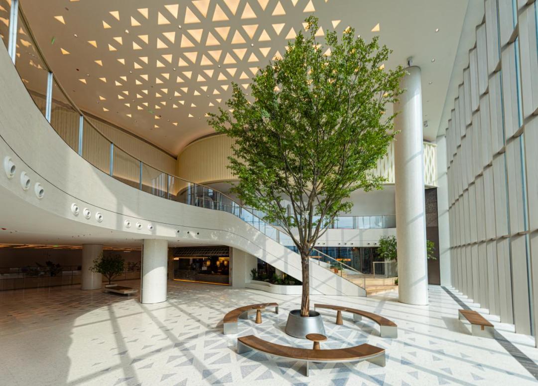 项目连廊覆盖的树形屋顶共43组,高35 - 40米,每组科技树覆盖面积约1039㎡,冠幅直径约40米,柱径2.5米,冠幅造型以银杏叶为灵感,独具个性。它不仅能遮日蔽荫,还具备空气质量调控、收集雨水、灯光联动等多种功能,集中体现了高科技元素。