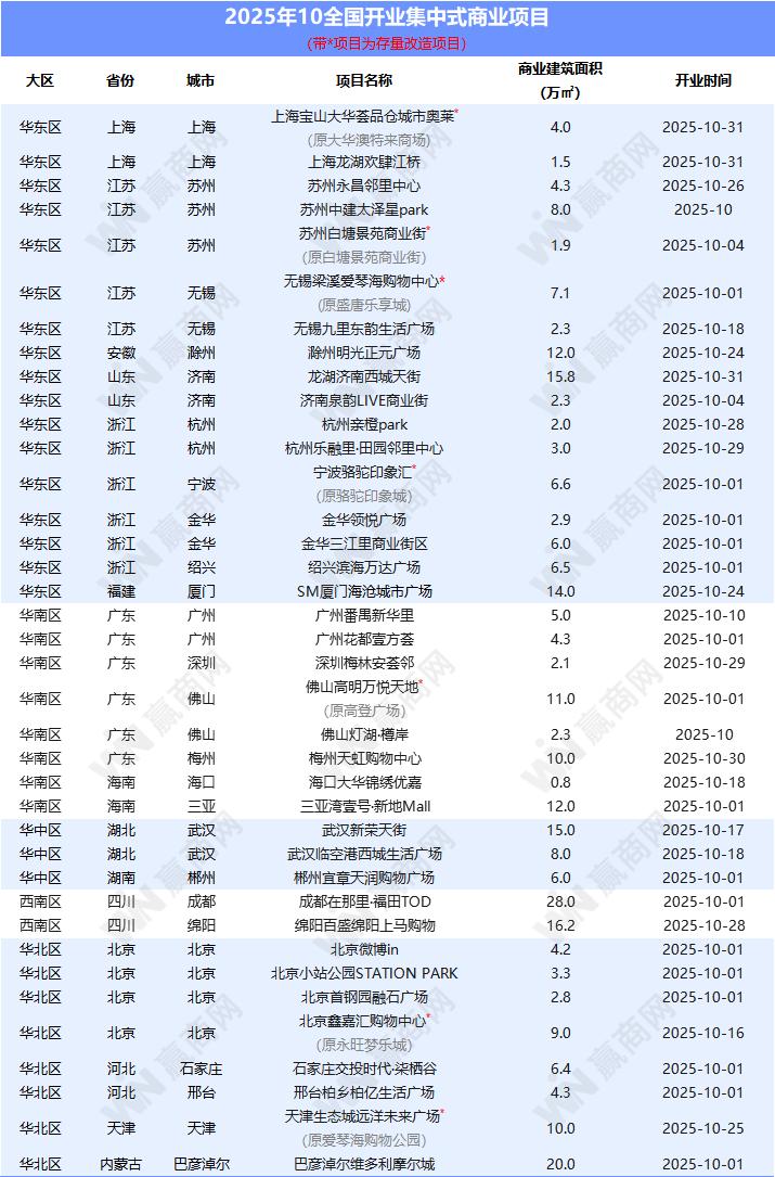 2025年10月全国开业集中式商业项目清单