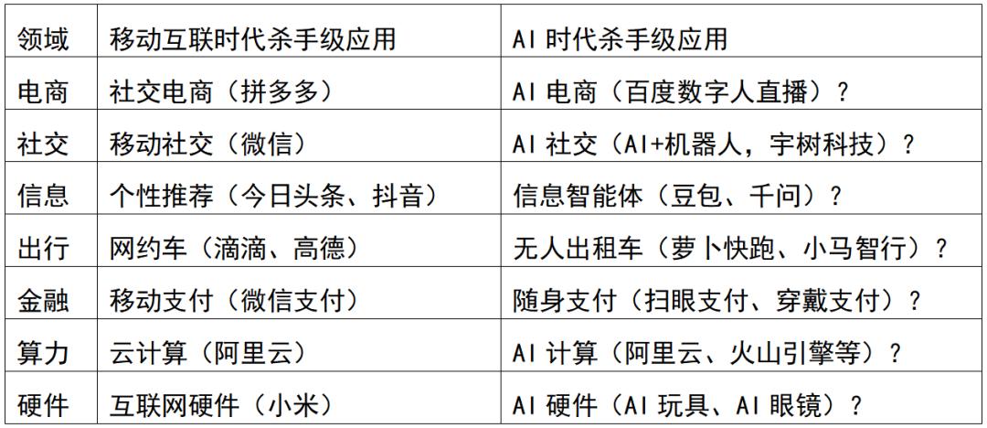对比移动互联网时代的创新产品和应用,AI时代的信息、社交、电商、出行、金融等杀手级应用究竟孕育于何处?
