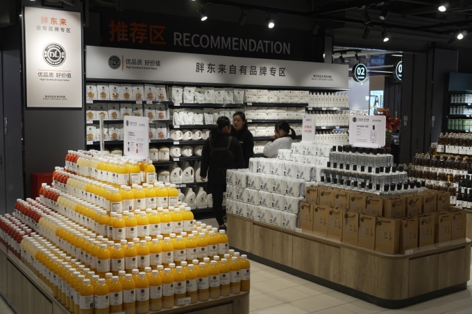 食百区域聚焦一二线知名品牌,同时强化自有品牌矩阵。胖东来自有品牌专区展示DL精酿黑啤酒、DL新疆长绒棉白色方巾等口碑商品;永辉自有品牌“品质永辉”与“永辉定制”系列也得到强化,“品质永辉橙汁”等新品受消费者欢迎。