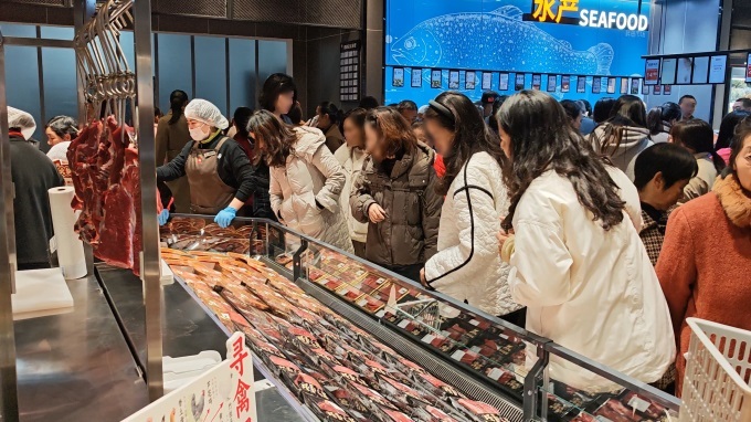 食材区整合了潮汕牛肉、活鲜水产、精品净菜三大品类,并搭配永辉定制鲜牛乳、简配方酸奶等永辉定制商品,构建了从锅底到食材的全链路品质消费链。