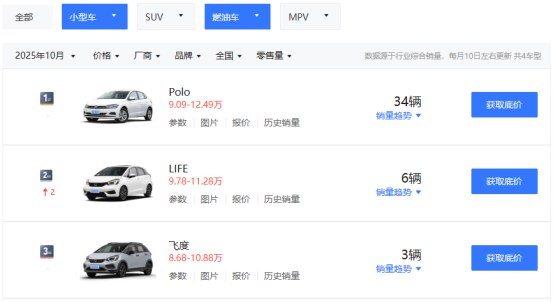 曾经的“国民神车”本田飞度,10月在燃油小型车市场排名第三。