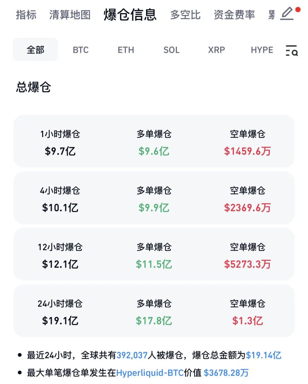 Coinglass数据显示,过去24小时内,加密货币全网合约爆仓19.14亿美元,爆仓人数达39.2万人。其中,多单爆仓17.8亿美元,空单爆仓1.3亿美元。最大单笔爆仓单发生在Hyperliquid - BTC,价值3678.28万美元。