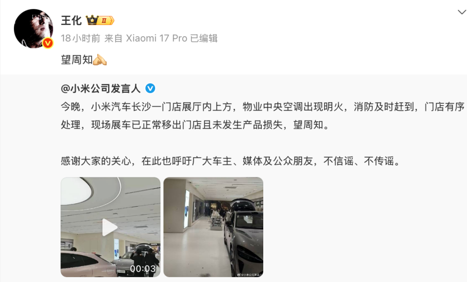 然而,11月20日晚,长沙一小米汽车展厅起火。“小米公司发言人”微博迅速回应,确认是门店展厅上方物业中央空调出现明火,消防部门及时处置。