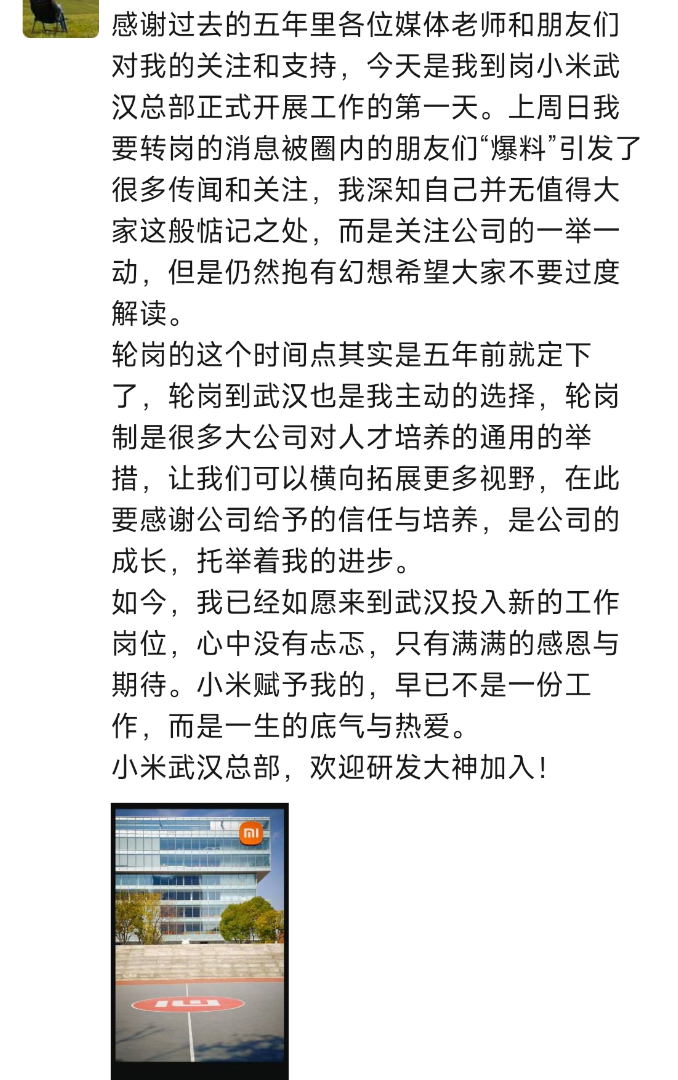 他在社交平台提到,当天是自己到小米武汉总部正式开展工作的第一天。上周日自己要转岗的消息被圈内朋友“爆料”,引发诸多传闻和关注。他表示深知自己没什么值得大家如此惦记的,大家更应关注公司动态。