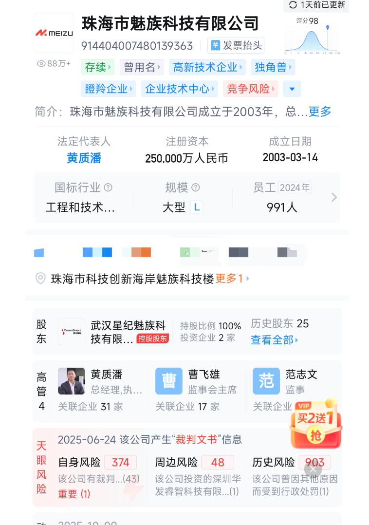 根据天眼查截至2025年11月21日的数据,魅族科技自身风险高达374条,周边风险48条,历史风险达到903条。司法案件有573条,涉诉关系有254条,其中49.8%为被告,大多涉及侵害作品信息网络传播权纠纷、侵害商标权、广告合同纠纷等。目前开庭公告有143条。这些法律风险可能会持续消耗其品牌信誉。