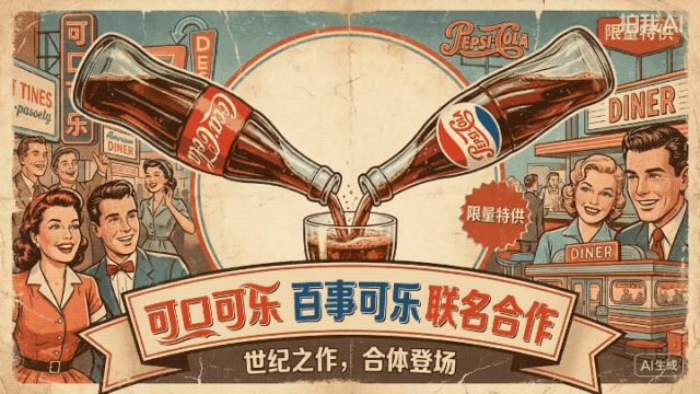 提示词为‘制作一张可口可乐和百事可乐联名宣传产品的横幅海报,要求用中文,整个海报要有复古元素’。