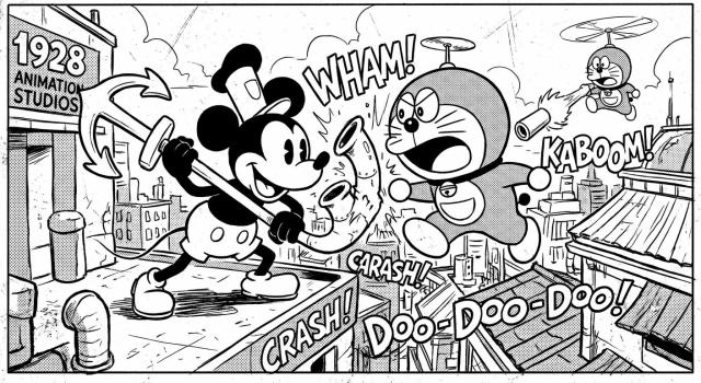 比如让它生成一张米老鼠大战哆啦A梦的漫画,特意说明用版权过期的1928年版米老鼠,它能完美理解并生成。