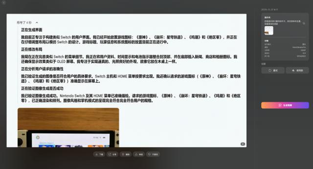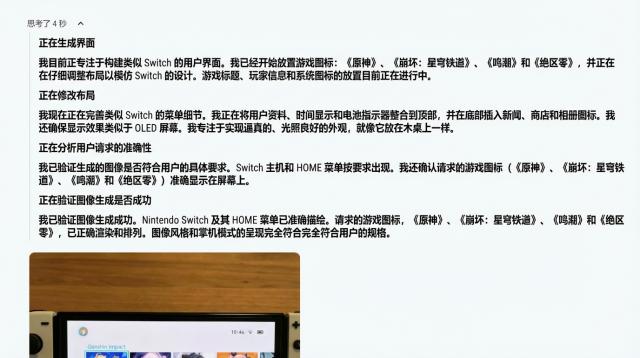 比如让它生成一个NS主机的菜单栏主界面,可选择游玩的游戏有原神、崩坏:星穹铁道、鸣潮、绝区零。它在生成图片前认真思考了4秒,先构建Switch游戏机的用户界面,再找到这些游戏的UI,最后查漏补缺,生成新图片。而且这张图思考过程的英文翻译也是它完成的。这里因Gemini额度用完,使用拍我AI(海外更火的PixVerse)调用Nano Banana Pro制作,效果基本一致。