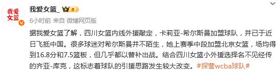 北京时间11月21日,据媒体人“我爱女篮”报道,四川女篮敲定内线外援,卡莉亚 - 希尔斯曼加盟球队,且已于近日飞抵中国。