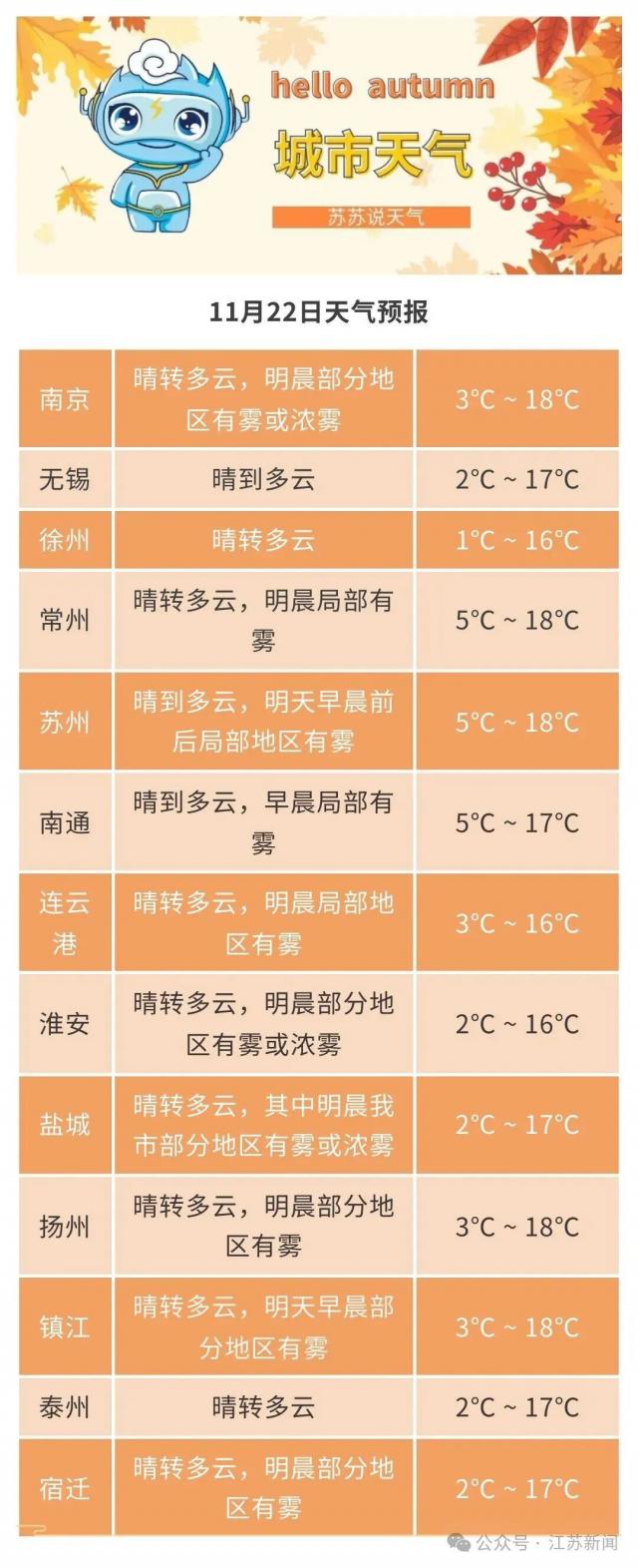 11月22日5时至20时,全省晴转多云。最高温度:淮北地区15℃左右,其他地区16 - 17℃;最低温度:沿江和苏南地区3 - 4℃,其他地区1 - 2℃。全省偏南风3 - 4级。