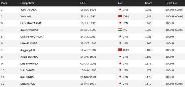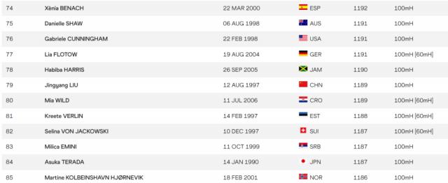 世界田联公布了女子100米栏的最新世界排名,新科全运会冠军刘景扬世界排名第79,亚洲排名第七;连续两届全运会亚军吴艳妮世界排名第33,亚洲排名第二。此外,林雨薇、夏思凝等名将世界排名分别为138和286位。