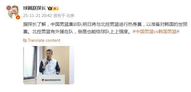 该媒体人表示:“据探长了解,中国男篮集训队明日将与北控男篮进行热身赛,以准备对韩国的世预赛。北控男篮有外援在队,倒是也能给球队上上强度。”