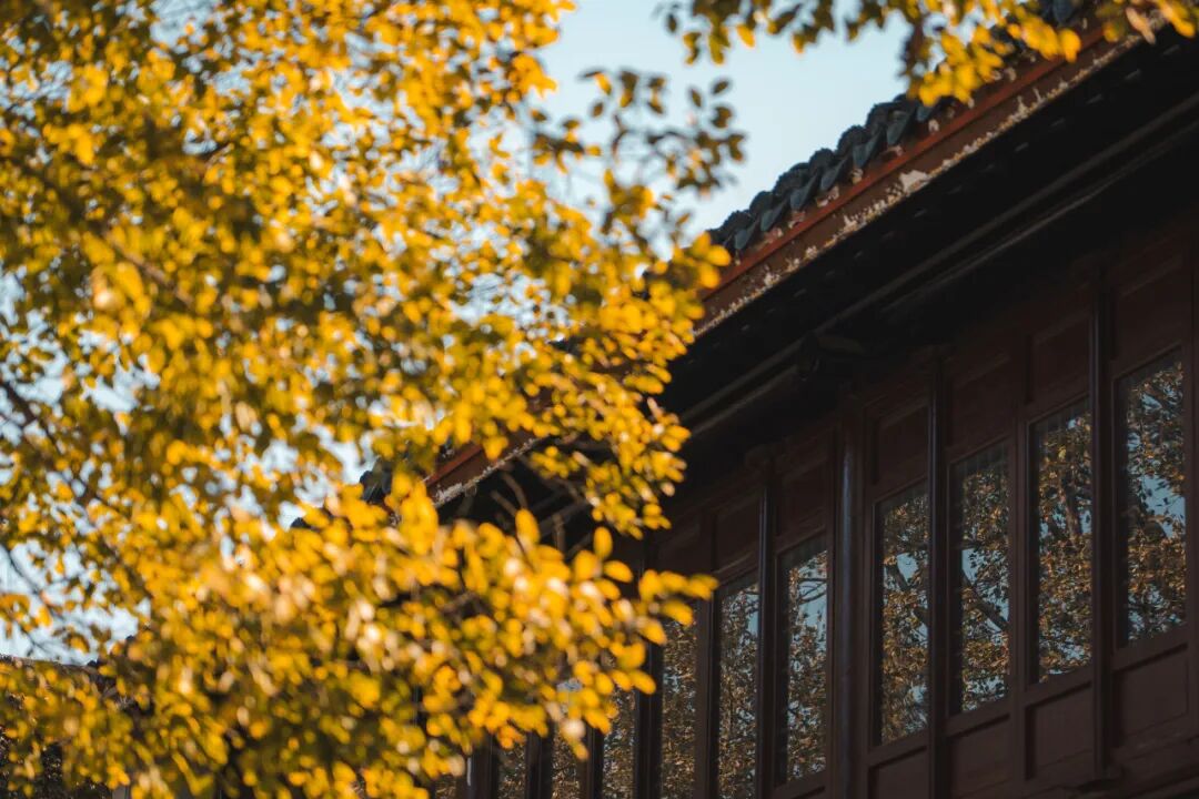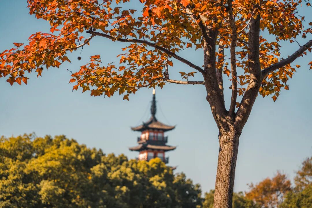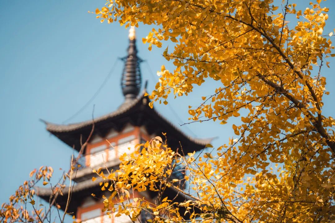 在法华塔下,高大的银杏树已然一片金黄,那璀璨的叶片与古塔的飞檐相互映衬,十分有趣。